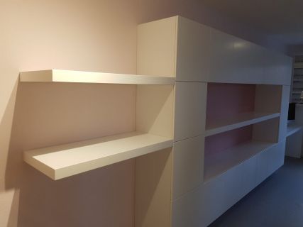 De unieke vormgeving, de zachtroze achtergrond, de geïntegreerde werkplek, de indirecte verlichting onder, in, en boven de wandkast: echt alles is bijzonder aan dit schitterende ontwerp gemaakt door de klant zelf.